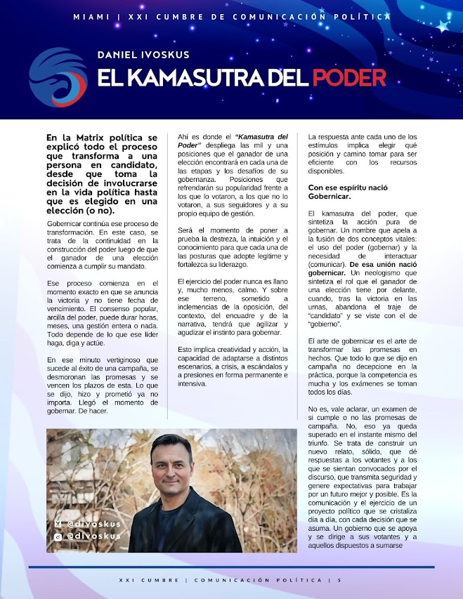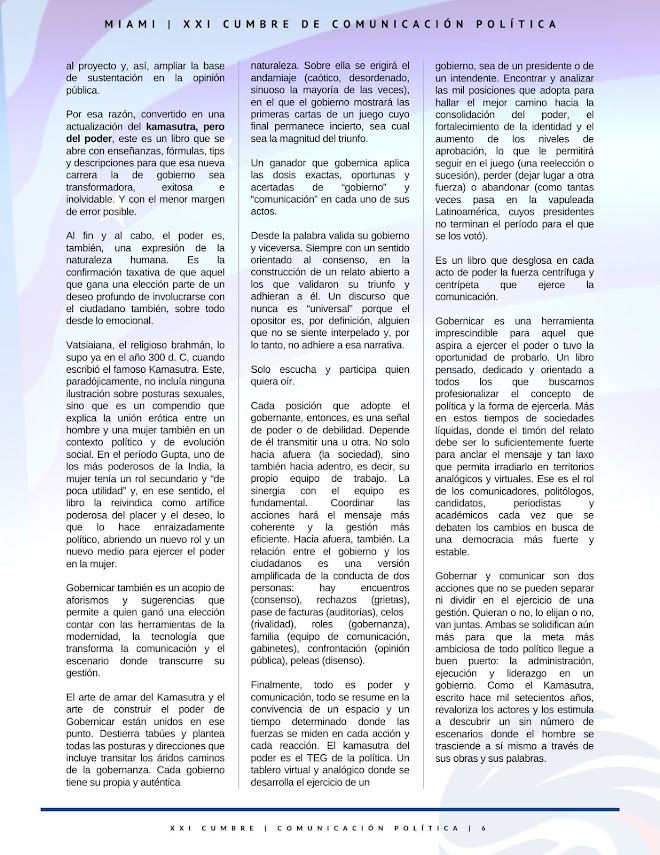 Con ese espíritu nació Gobernicar. El kamasutra del poder, que sintetiza la acción pura de gobernar. Un nombre que apela a la fusión de dos conceptos vitales: el uso del poder (gobernar) y la necesidad de interactuar (comunicar). De esa unión nació gobernicar. Un neologismo que sintetiza el rol que el ganador de una elección tiene por delante, cuando, tras la victoria en las urnas, abandona el traje de “candidato” y se viste con el de “gobierno”.