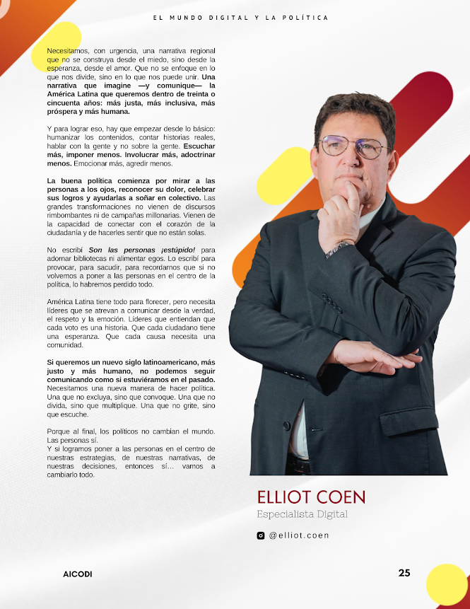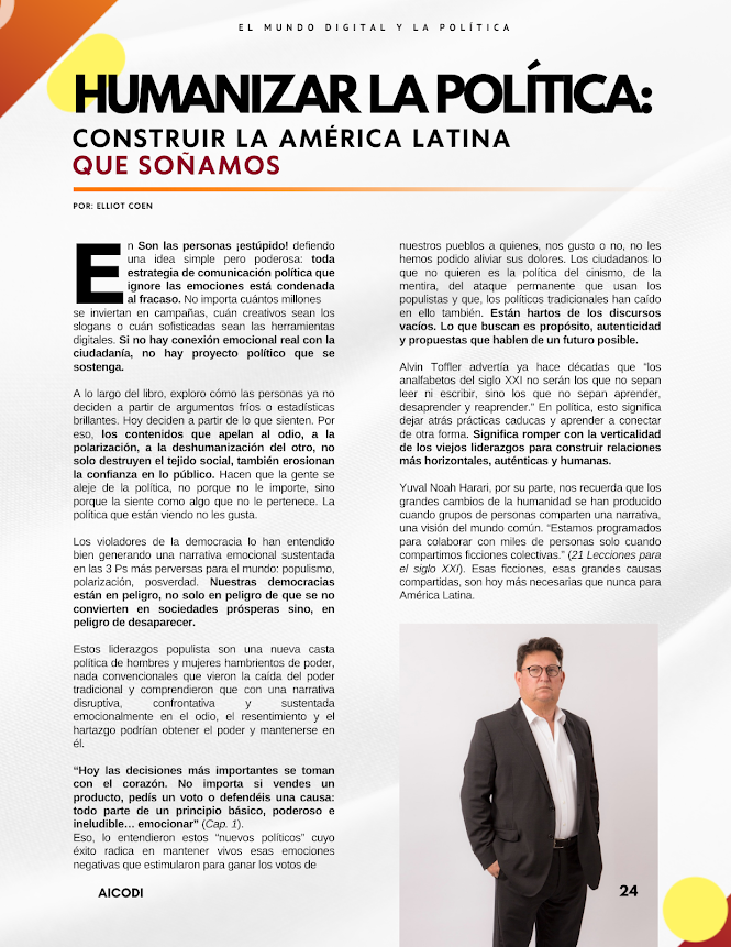 Por: Elliot Coen En Son las personas ¡estúpido! defiendo una idea simple pero poderosa: toda estrategia de comunicación política que ignore las emociones está condenada al fracaso. No importa cuántos millones se inviertan en campañas, cuán creativos sean los slogans o cuán sofisticadas sean las herramientas digitales. Si no hay conexión emocional real con la ciudadanía, no hay proyecto político que se sostenga. A lo largo del libro, exploro cómo las personas ya no deciden a partir de argumentos fríos o estadísticas brillantes. Hoy deciden a partir de lo que…