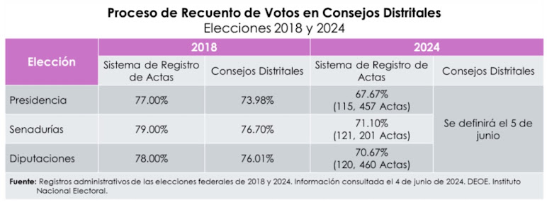 Los cómputos distritales comenzarán el 5 de junio a las 8:00 horas en cada sede distrital, y hasta el momento, los datos disponibles indican que la cantidad y porcentaje de actas sujetas a recuento se encuentran dentro de los estándares observados en elecciones anteriores, incluso por debajo de los registrados en 2018.
