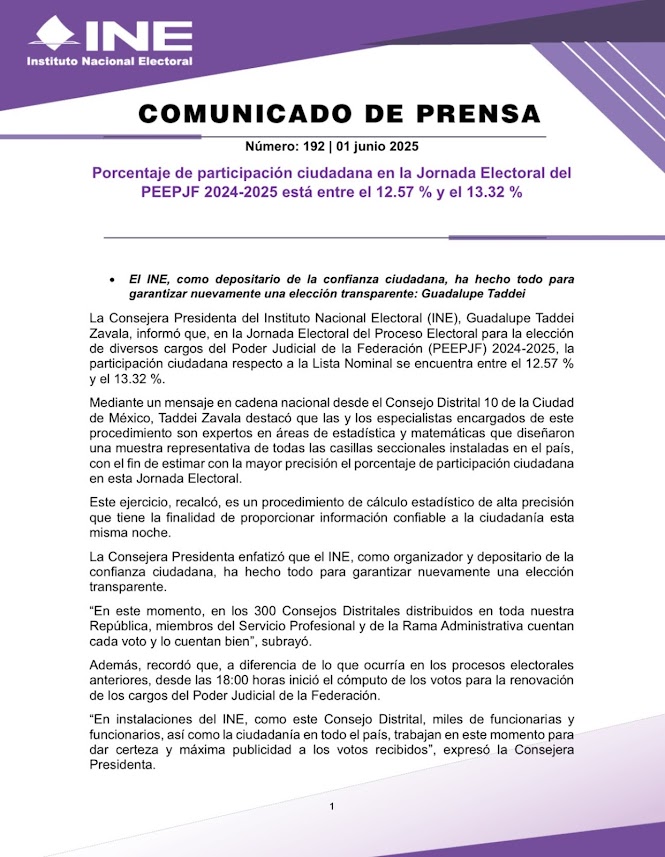 En un mensaje dirigido a la ciudadanía, la Consejera Presidenta del Instituto Nacional Electoral (INE), Guadalupe Taddei Zavala, informó que la participación ciudadana durante la Jornada Electoral del Proceso Electoral para la elección de cargos del Poder Judicial de la Federación (PEEPJF) 2024-2025 se ubicó en un rango preliminar de entre 12.57 % y 13.32 % del total de la Lista Nominal.