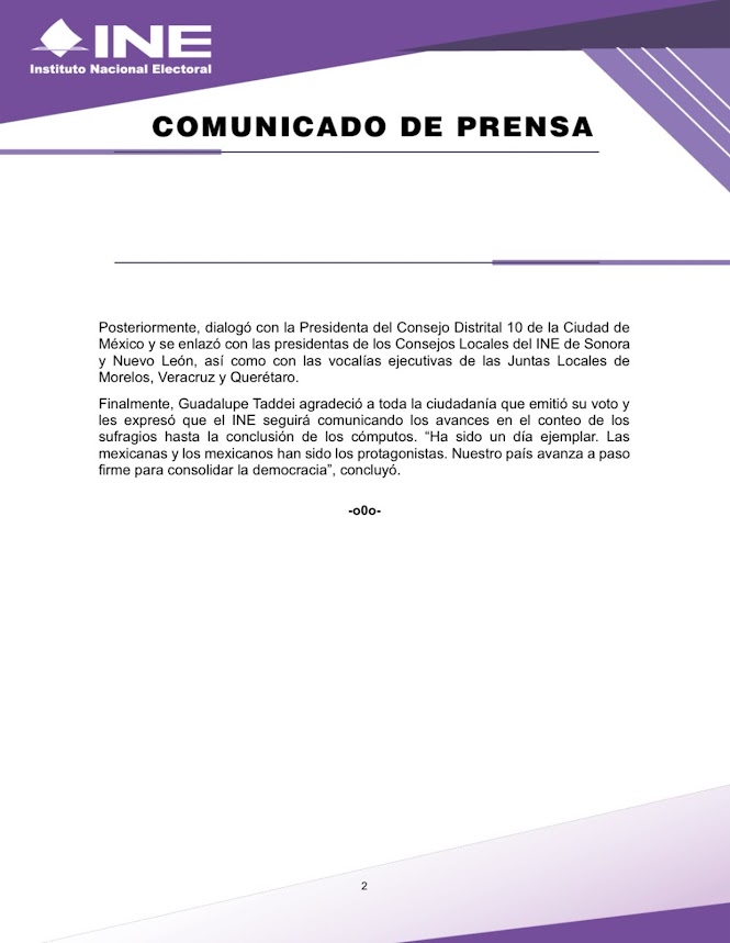 “El INE continúa informando en tiempo real los avances del conteo. Ha sido una jornada ejemplar en términos de organización. Las y los ciudadanos han vuelto a ser el centro de nuestra democracia”, concluyó.