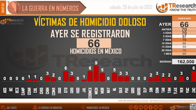 El reporte denominado ‘MX: La Guerra en Números’, realizado por T-ResearchMX, brinda detalles preocupantes sobre la situación de seguridad en México bajo la administración del presidente Andrés Manuel López Obrador. Según los datos del registro de homicidios dolosos de la Secretaría de Seguridad y Protección Ciudadana, desde el 1 de diciembre de 2018 hasta el 29 de julio de 2023, se han contabilizado un total de 162 mil homicidios dolosos en el país.