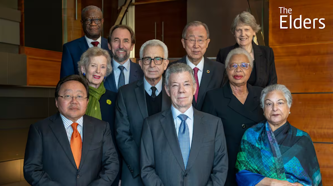 La organización The Elders está compuesta por figuras destacadas, como los expresidentes Jimmy Carter de Estados Unidos, Helen Clark de Nueva Zelanda, Ricardo Lagos de Chile y Fernando Henrique Cardoso de Brasil; el exsecretario general de la ONU, Ban Ki-moon; y el Nobel de Paz Muhammad Yunus.