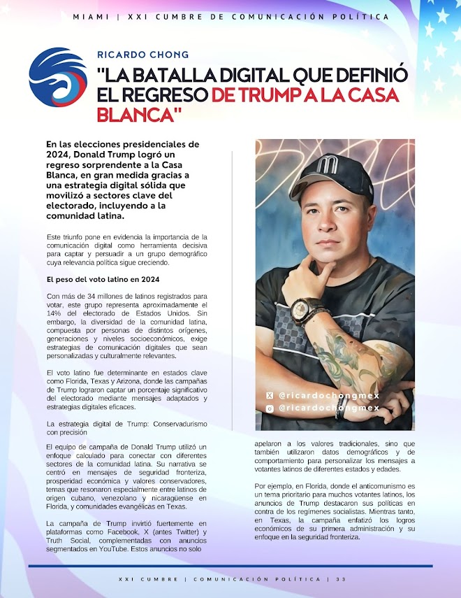 Por Ricardo Chong En las elecciones presidenciales de 2024, Donald Trump logró un regreso sorprendente a la Casa Blanca, en gran medida gracias a una estrategia digital sólida que movilizó a sectores clave del electorado, incluyendo a la comunidad latina. Este triunfo pone en evidencia la importancia de la comunicación digital como herramienta decisiva para captar y persuadir a un grupo demográfico cuya relevancia política sigue creciendo. El peso del voto latino en 2024 Con más de 34 millones de latinos registrados para votar, este grupo representa aproximadamente el 14%…