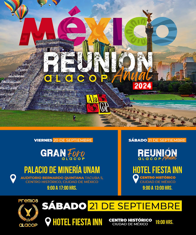 El sábado 21 de septiembre se llevará a cabo la Reunión Anual ALACOP en el Hotel Fiesta Inn (Centro Histórico), de 9:00 a 13:00 horas. Este encuentro se centrará en la evaluación de proyectos y la planificación de futuras iniciativas, proporcionando un espacio para el diálogo y la colaboración entre los miembros de la asociación.