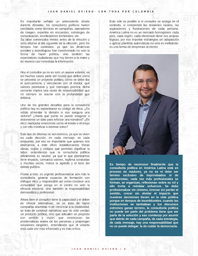 El panorama político actual de América Latina sin duda está marcado por una ciudadanía cada vez más crítica, una institucionalidad en constante tensión y una fuerte presencia de emociones colectivas donde el papel de la consultoría política ha cobrado una visibilidad cada vez más importante donde ya no se trata únicamente de ganar elecciones. La consultoría política hoy más que nunca tiene la responsabilidad de contribuir a construir democracias más sólidas, procesos electorales más éticos y liderazgos más conscientes con narrativas más honestas y responsables.