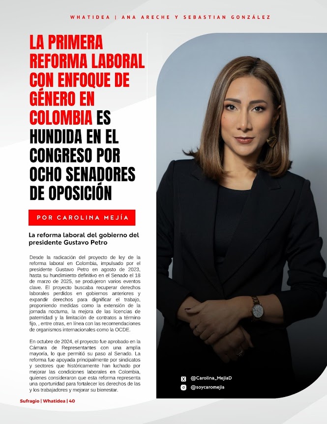 Por: Carolina Mejía Díaz La primera reforma laboral con enfoque de género en Colombia es hundida en el Congreso por ocho senadores de oposición Desde la radicación del proyecto de ley de la reforma laboral en Colombia, impulsado por el presidente Gustavo Petro en agosto de 2023, hasta su hundimiento definitivo en el Senado el 18 de marzo de 2025, se produjeron varios eventos clave. El proyecto buscaba recuperar derechos laborales perdidos en gobiernos anteriores y expandir derechos para dignificar el trabajo, proponiendo medidas como la extensión de la…