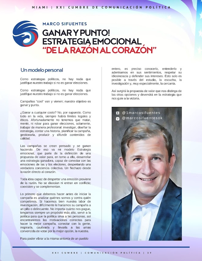 Las campañas se crean pensado y se ganan haciendo. De eso va mi modelo Estrategia emocional, que parte de la definición de una propuesta de valor para, en torno a ella, desarrollar una estrategia ganadora, capaz de conectar con las emociones de las y los electores, despertando una verdadera conciencia colectiva. Un flechazo desde la razón directo al corazón.