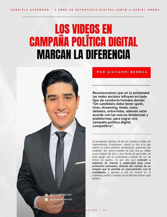 Por: Giovanni Berroa Reconozcamos que en la actualidad las redes sociales influyen en todo tipo de conducta humana donde: “Un candidato debe tener spots, lives, streaming, feeds, reels, debates, entrevistas, además estar acorde con las nuevas tendencias y plataformas, para lograr una campaña política digital competitiva”. El presidente número 34 de los Estados Unidos de Norteamérica, Eisenhower, marcó un hito a lo que refiere en spots políticos publicitarios, partiendo del contexto, Ike -como nombre de pila- era un militar cuya imagen de una u otra forma no generaba un total…