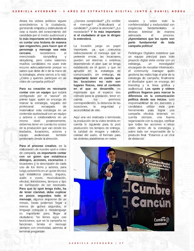 Politólogos Digitales establece que un equipo principal para todo proyecto digital debe contar con un estratega, un investigador encargado de recopilar información, el community manager quién gestiona las redes bajo el pilar de la estrategia de campaña, finalmente el diseñador quien se encarga del branding y la línea gráfica y audiovisual. Los spots y videos políticos llegaron para marcar la diferencia en la comunicación política desde sus inicios, será responsabilidad de los asesores y candidatos utilizar esta gran herramienta para lograr una campaña efectiva teniendo en cuenta siempre, una buena organización con tu equipo, verificar que todas las acciones e ideas estén dentro de la estrategia y sobre todo ser responsable de tu producto final. “Estamos a un click de distancia”.