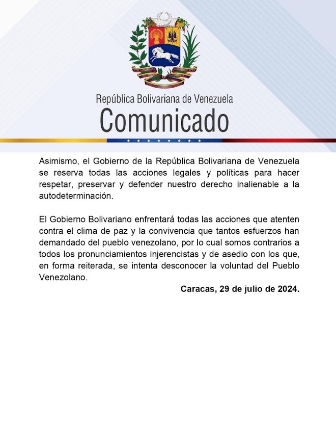 “Venezuela expresa su más firme rechazo ante las acciones y declaraciones injerencistas de un grupo de gobiernos de derecha, subordinados a Washington y comprometidos con los más oscuros postulados ideológicos del fascismo internacional, intentando revivir el fracasado y derrotado Grupo de Lima”, indica el comunicado oficial del gobierno de Maduro.