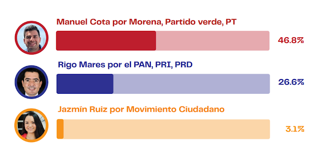 En un careo, donde el candidato de Morena fuera Manuel Cota, por el Frente, Rigo Mares y por MC, Jazmín Ruíz; ganaría muy fácilmente el candidato morenista con más de 20 puntos de ventaja.