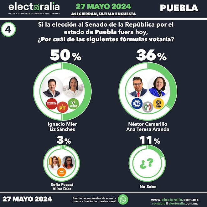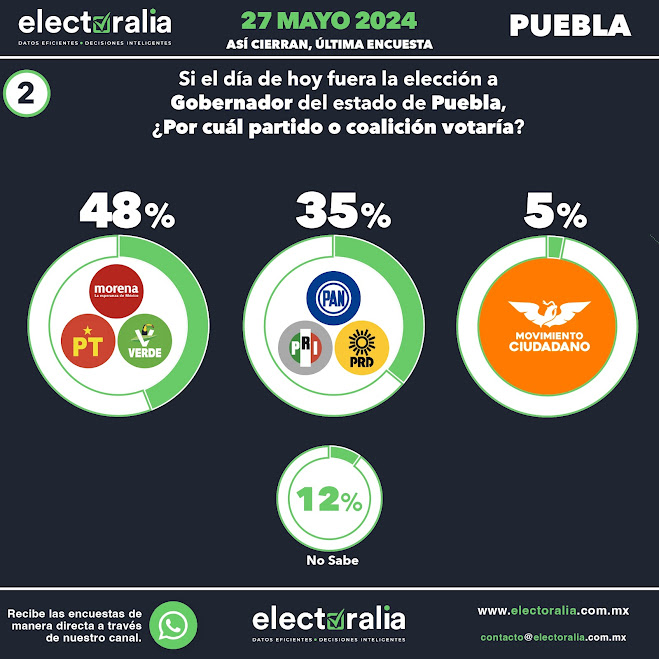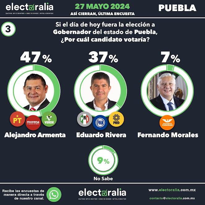 México De acuerdo con una encuesta realizada por Electoralia en Puebla, Morena lidera la preferencia de voto entre los poblanos. Ante la pregunta de “Si el día de hoy fuera la elección a gobernador de Puebla, ¿por cuál partido votaría?”, Morena se llevó el 42% de los votos, mientras que el PAN obtuvo un 30% y el PRI 5%. Por otro lado, cuando se les cuestionó sobre quien es su favorito para ocupar la gubernatura del estado, Alejandro Armenta Mier, candidato de Morena, obtuvo el 47% de los votos,…