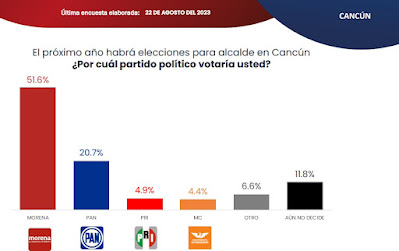 A la pregunta ¿Por qué partido votaría usted para alcalde en Cancún? Morena lleva la delantera con un 51.6 por ciento, mientras que el PAN tiene apenas un 20.7 por ciento, el PRI con un 4.9 por ciento, Movimiento Ciudadano un 4.4 por ciento, otro tiene el 6.6 por ciento y los indecisos tienen el 11.8 por ciento.