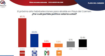 México Redacción Sufragio Morena lleva la delantera en la intención de voto en las alcaldías de Cancún, Playa del Carmen y Chetumal, de acuerdo a la más reciente encuesta de Massive Caller, de cara a las próximas elecciones. A la pregunta ¿Por qué partido votaría usted para alcalde en Cancún? Morena lleva la delantera con un 51.6 por ciento, mientras que el PAN tiene apenas un 20.7 por ciento, el PRI con un 4.9 por ciento, Movimiento Ciudadano un 4.4 por ciento, otro tiene el 6.6 por ciento y…