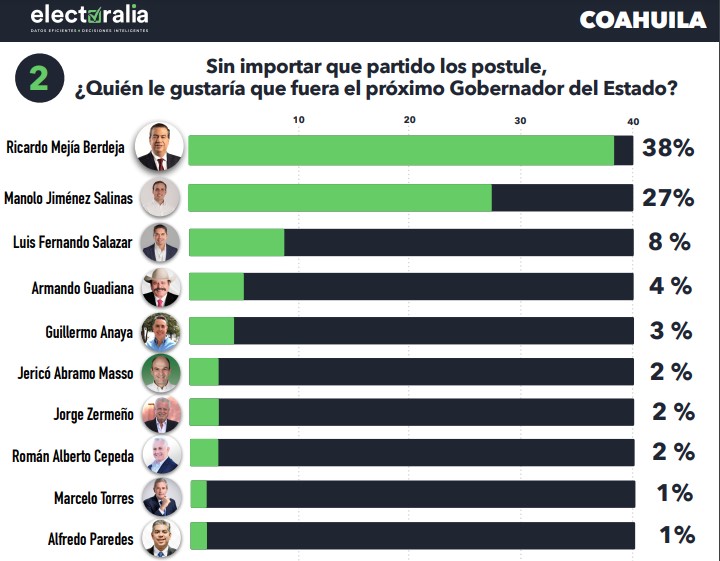 Mejía Berdeja con 38 por ciento de preferencia, seguido por el priísta Manolo