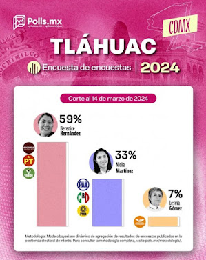 En Tláhuac, Berenice Hernández, candidata de Morena, lidera con un 59% de las preferencias, seguida por Nidia Martínez del PAN, PRI y PRD con un 33%, mientras que Lesvia Gómez del partido Emecista se sitúa en un 7%.