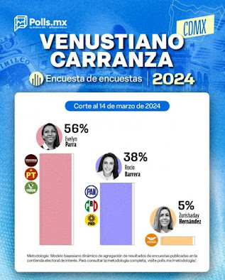 En Venustiano Carranza, Evelyn Parra de Morena busca la reelección con un 56% de ventaja sobre Rocío Barrera del PRD con un 38%, mientras que Zurishaday Hernández de MC cuenta con un 5%.