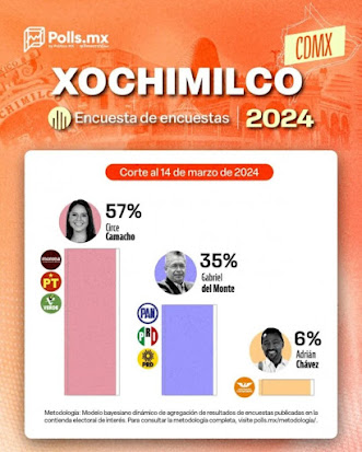 Por último, en Xochimilco, Circe Camacho de Morena encabeza las preferencias con un 57%, seguida por Gabriel del Monte de la alianza opositora con un 35% y Adrián Chávez del partido Emecista con un 6%.