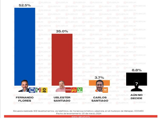En Metepec, el candidato panista Fernando Flores Fernández, en busca de la reelección dentro de la coalición PRI-PAN-PRD, lidera con el respaldo del 52.5% de los encuestados, frente al 35% de Ublester Santiago, candidato de la coalición Morena-PT.