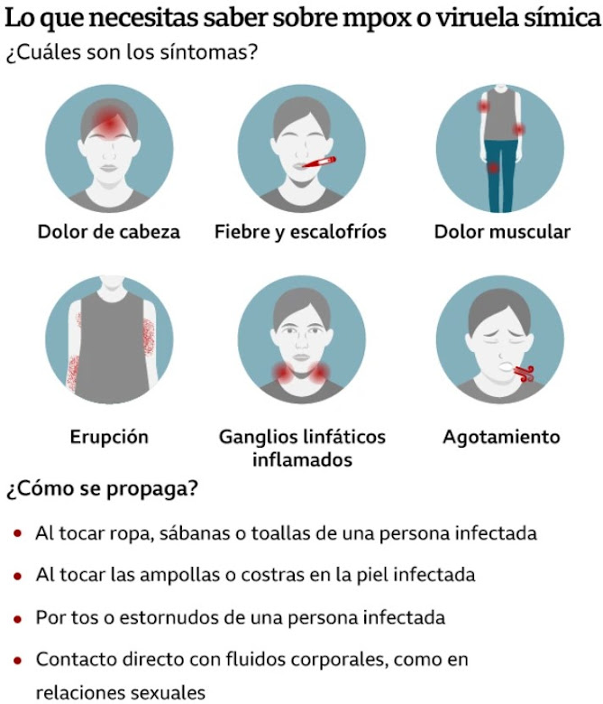 La viruela símica, anteriormente conocida como viruela del mono, se transmite principalmente a través del contacto directo con personas infectadas, ya sea a través de relaciones sexuales o por contacto cercano con la piel o la respiración. Los síntomas incluyen fiebre, erupciones cutáneas y, en casos graves, la enfermedad puede ser mortal. La tasa de mortalidad es de aproximadamente 4 de cada 100 casos.
