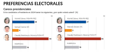 Sheinbaum, como abanderada de la coalición Morena-PVEM-PT, cuenta con 46 por ciento de las preferencias, mientras que Gálvez capta 28 por ciento; Samuel García, como posible abanderado de MC, 8 por ciento, con 18 por ciento de indefinidos.