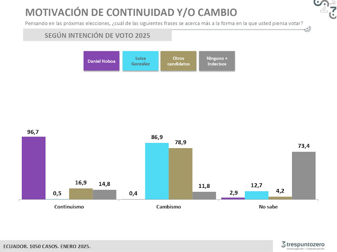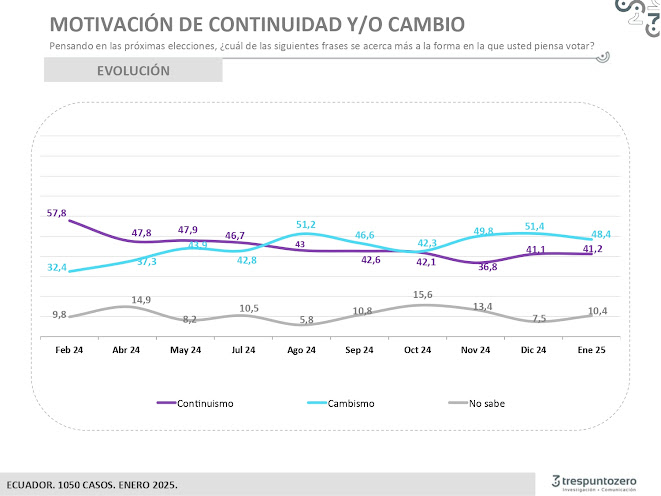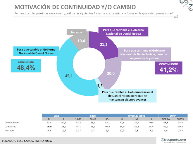 Un aspecto relevante en el estudio es la división en torno a la continuidad del gobierno. Mientras que un 48% de los ecuatorianos se inclina por un cambio de mandatario, un 41% favorece la continuidad del gobierno de Noboa, aunque dentro de este grupo, un 20% demanda mejoras significativas en la gestión actual.