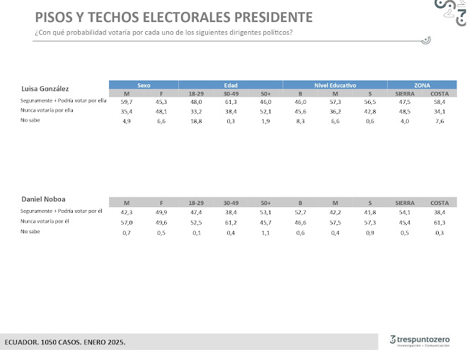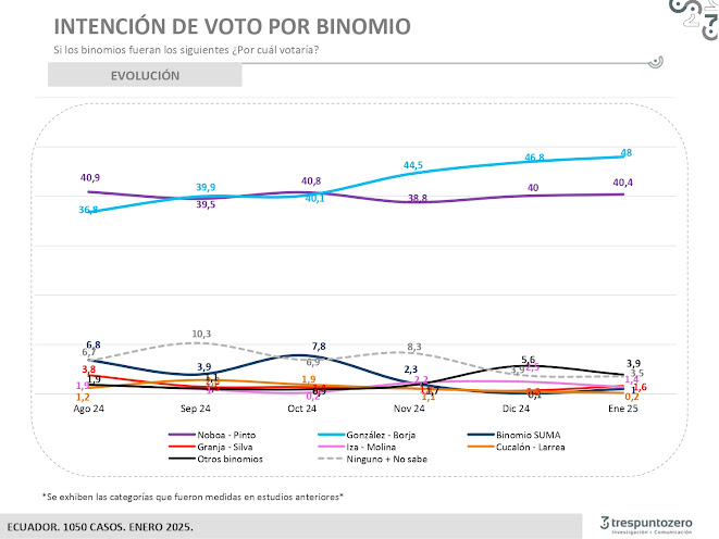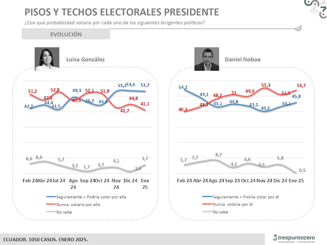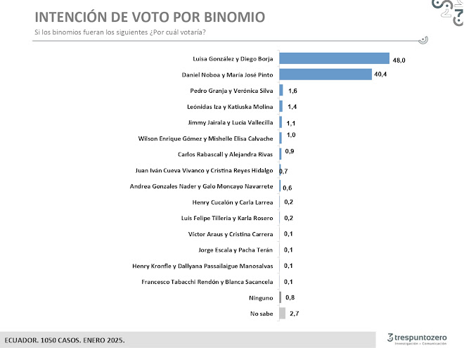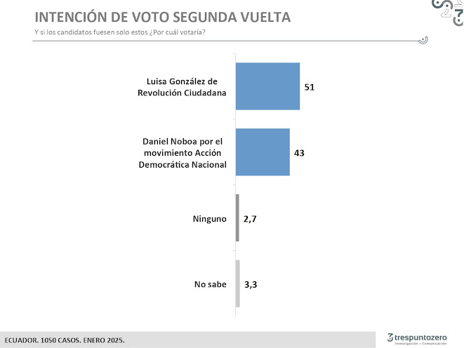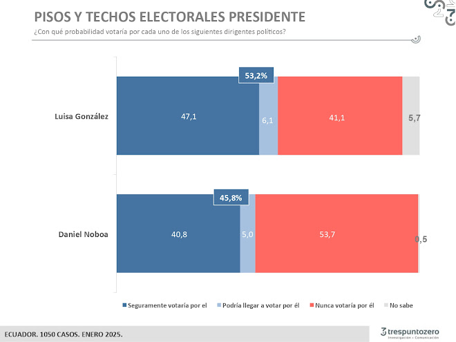 Ecuador Ecuador se prepara para elegir a su próximo presidente el 9 de febrero, y el escenario político está marcado por una intensa polarización. Según un reciente sondeo de la investigadora argentina Shila Vilker, Luisa González, principal opositora, lidera las encuestas para la primera vuelta, con una notable ventaja sobre el actual presidente, Daniel Noboa. En los últimos estudios, las intenciones de voto se concentran principalmente entre González y Noboa, con ambos candidatos alcanzando un impresionante 88% del apoyo popular. La fórmula González-Borja se impone con una ventaja de…
