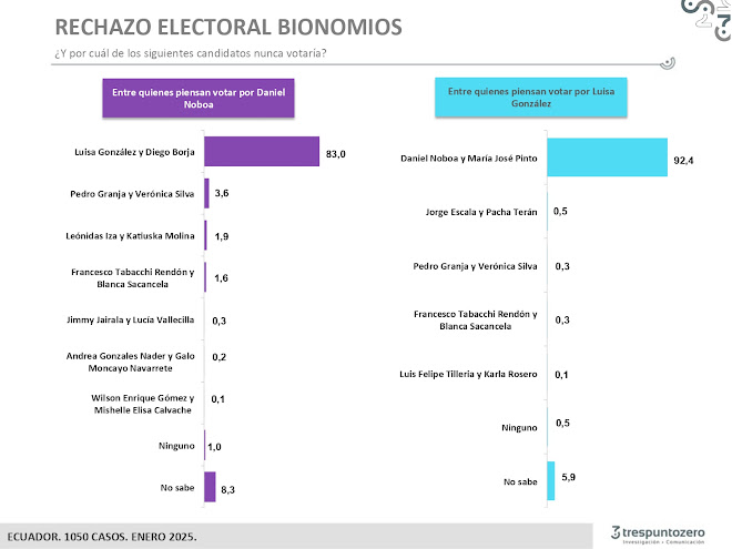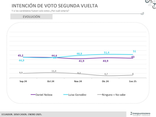 En caso de llegar a una segunda vuelta, el pronóstico favorece a Luisa González, quien obtendría el 51% de los votos frente al 43% de Noboa. Otro dato crucial es la proporción de votantes que afirman que “nunca votarían” por los candidatos: el 41% de los encuestados rechaza a González, mientras que el 53% expresa la misma postura respecto al actual presidente, lo cual podría ser determinante en un eventual balotaje.