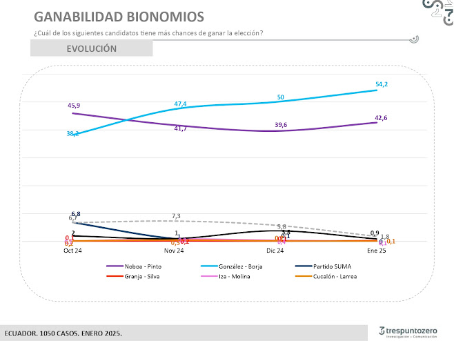En los últimos estudios, las intenciones de voto se concentran principalmente entre González y Noboa, con ambos candidatos alcanzando un impresionante 88% del apoyo popular. La fórmula González-Borja se impone con una ventaja de ocho puntos sobre el binomio Noboa-Pinto. Vilker analizó la situación y subrayó que la contienda electoral se ha polarizado fuertemente entre estas dos fuerzas políticas, marginando a las opciones de terceros candidatos. “La disputa se intensifica alrededor de los dos grandes candidatos, generando una dinámica de gran polarización”, explicó Vilker a Radio Pichincha.