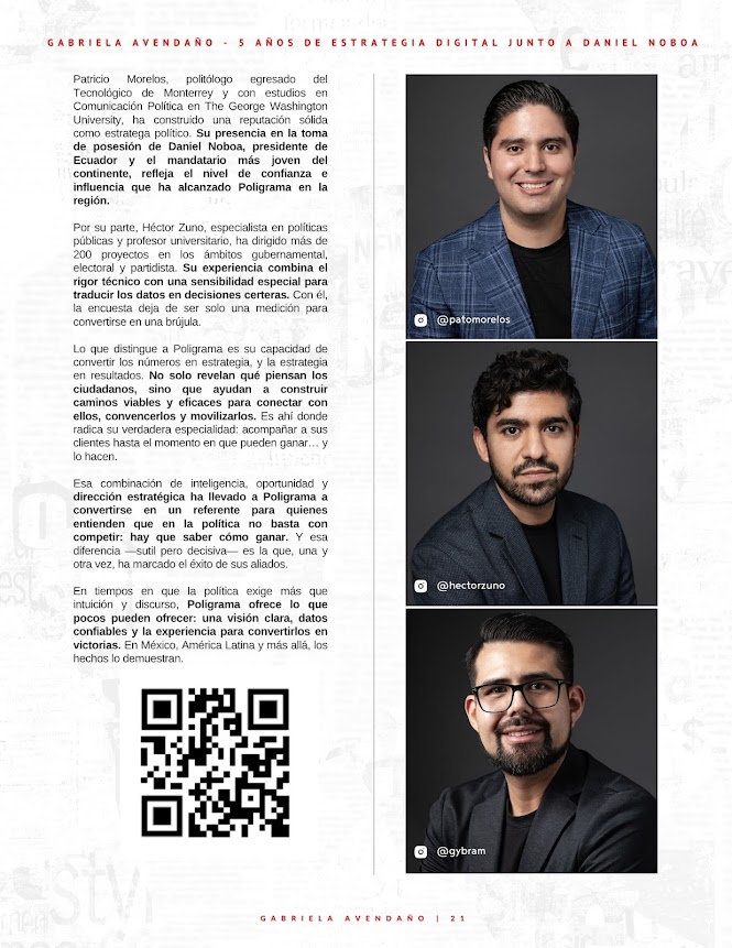Fundada por Patricio Morelos y Héctor Zuno, Poligrama ha sido una pieza estratégica en campañas y gobiernos exitosos en México y distintos países de América Latina. Su propuesta va más allá de medir: se trata de entender, anticipar y actuar. Gracias a una metodología que combina tecnología, análisis profundo y lectura estratégica del contexto político, han logrado lo que pocos: ayudar a sus clientes a alcanzar el punto exacto donde la posibilidad se convierte en victoria.
