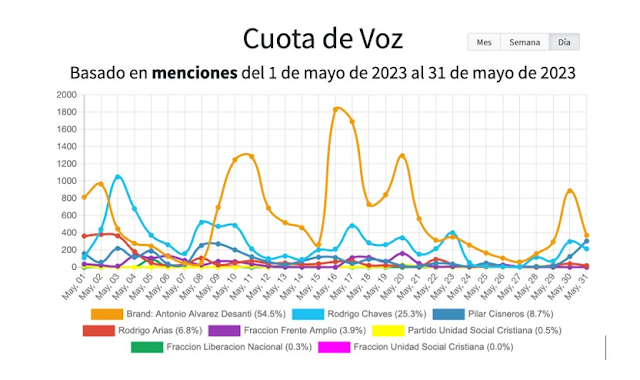 El empresario y al parecer ex político opositor –gogleado-, Antonio Álvarez Desanti fue quien domino ampliamente la conversación ese mes en Redes Sociales con un 54.4%; por su parte. el presidente Chaves le siguió con un 25.3%; luego apareció el lado femenino en la disputa y de la “voz” por lo menos digital de la diputada “oficialista” Pilar Cisneros con un 8.7% y nuevamente lejos por bastante con un 6.8%, el presidente del Congreso, el otro Rodrigo, pero Arias quien –gogleado- resultó hermano del otrora Presidente Tico y también galardonado Premio Nobel de la Paz, Oscar Arias Sánche; ya con una ínfima participación en la conversación, aparece la fracción legislativa del Frente Amplio, algo que también me sorprendió, cosa que no sucede en mi país de forma frecuente –comunicación como unidad comunicacional-.