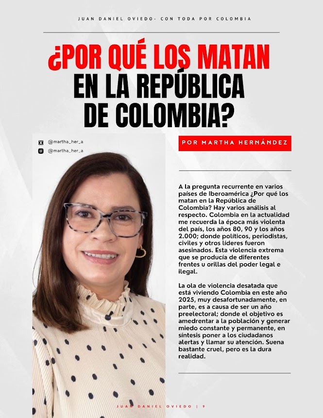 Por: Martha Hernández. Doctoranda y Magíster en ciencias políticas. martachester@gmail.com A la pregunta recurrente en varios países de Iberoamérica ¿Por qué los matan en la República de Colombia? Hay varios análisis al respecto. Colombia en la actualidad de me recuerda la época más violenta del país, los años 80, 90 y los años 2.000; donde políticos, periodistas, civiles y otros líderes fueron asesinados. Esta violencia extrema que se producía de diferentes frentes u orillas del poder legal e ilegal. La ola de violencia desatada que está viviendo Colombia en este…