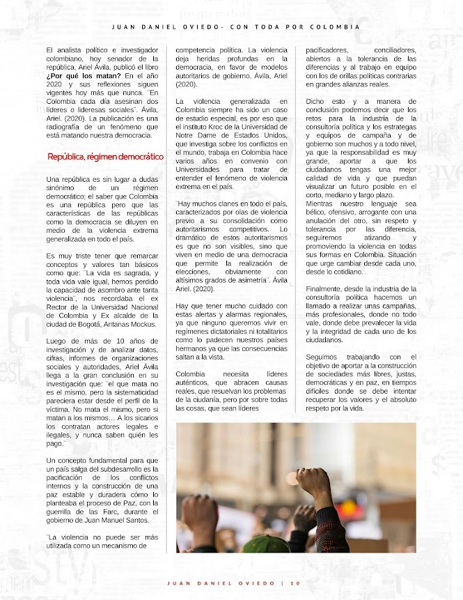 El analista político e investigador colombiano, hoy senador de la república, Ariel Ávila, publicó el libro ¿Por qué los matan? En el año 2020 y sus reflexiones siguen vigentes hoy más que nunca. ¨En Colombia cada día asesinan dos líderes o lideresas sociales¨. Ávila, Ariel. (2020). La publicación es una radiografía de un fenómeno que está matando nuestra democracia.