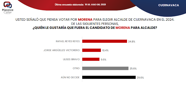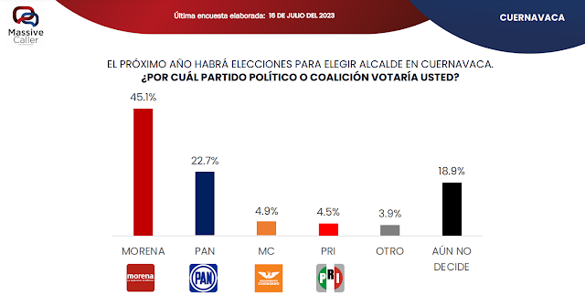 Según el más reciente estudio de preferencias electorales realizado por Massive Caller en la alcaldía de Cuernavaca, Morelos, Morena se mantiene como el partido favorito con un 45.1% de apoyo, seguido por el PAN con un 22.7%. El resto de los partidos, incluyendo al PRI y otros, tienen menos del 5% de preferencias. Un 18.9% de los encuestados aún no ha decidido su voto.