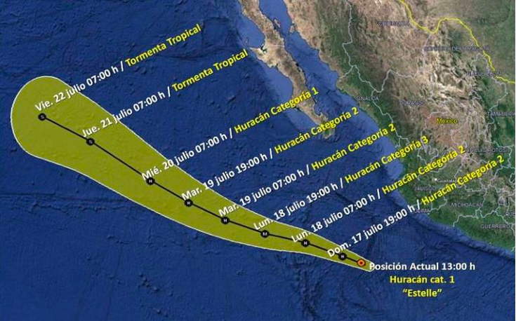 Redacción | BCS, México El Huracán Estelle de categoría 1 se localizó este domingo al suroeste de las costas de Jalisco y Colima y según el pronóstico del Servicio Meteorológico Nacional continuará intensificándose durante las próximas horas y sus extensas bandas nubosas en interacción con un canal de baja presión originarán lluvias, rachas fuertes de viento y oleaje elevado en las costas del occidente y sur del país y en Baja California Sur. Para la tarde de este lunes 18 de julio, el huracán Estelle en categoría 3 estará a…