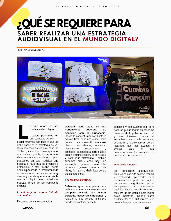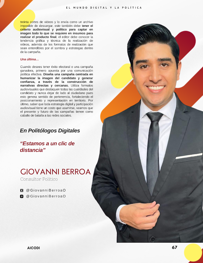 Cuando desees tener éxito electoral o una campaña ganadora, primero apuesta por una comunicación política efectiva. Diseña una campaña centrada en humanizar la imagen del candidato y generar confianza, a través de la construcción de narrativas directas y cercanas. Utiliza formatos audiovisuales que destaquen todas las cualidades del candidato y nunca dejar de lado al ciudadano pues esto genera sentido de pertenencia, fortaleciendo el posicionamiento y representación en territorio. Por último, saber que toda estrategia digital y participación audiovisual tiene un costo que asumirse, veamos que el presente y futuro de las campañas tienen como caballo de batalla a las redes sociales.
