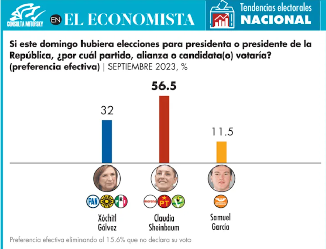 Del total de los ciudadanos consultados, 56.5% contestó que darán su sufragio a Claudia Sheinbaum, virtual candidata de Morena, PT y PVEM, mientras que Xóchitl Gálvez Ruiz (PAN, PRI y PRD) obtuvo 32%, y 11.5% de los participantes contestó que su opción es Samuel García, de Movimiento Ciudadano.