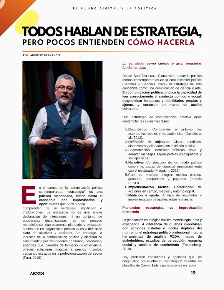 Todos hablan de estrategia, pero pocos entienden cómo hacerla Por: Augusto Hernández IntroducciónEn el campo de la comunicación política contemporánea, “estrategia” es una palabra manoseada, citada hasta el cansancio por improvisados y oportunistas que poco o nada comprenden de su verdadero significado e implicaciones. La estrategia no es una simple declaración de intenciones, ni un conjunto de ocurrencias desarticuladas; es un proceso metodológico, rigurosamente planeado y ejecutado, sustentado en diagnósticos precisos y en la definición clara de objetivos y acciones. Sin embargo, la industria de la comunicación política y electoral…