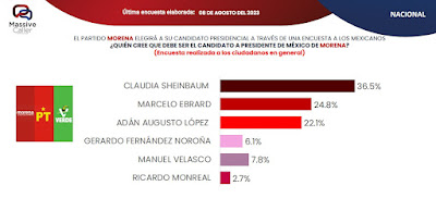 Adán Augusto López tiene el 22.1 de intención de voto, mientras que Gerardo Fernández Noroña el 6.1 por ciento. Manuel Velasco tiene el 7.8 por ciento de apoyo, mientras que Ricardo Monreal el 2.7 por ciento.