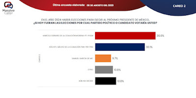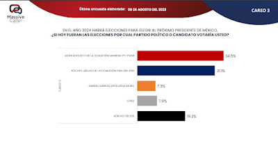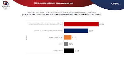 Si las elecciones presidenciales fueran entre Xóchitl Gálvez, del Frente opositor y Claudia Sheinbaum, de Morena-PVEM-PT, la senadora de oposición obtendría 30.01 por ciento de las preferencias, 12 puntos por debajo de la ex jefa de Gobierno, quien captaría 42.9 por ciento, según datos de la encuestadora Massive Caller, realizada el 8 de Agosto del 2023.