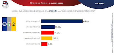 En el caso de la contienda interna en el Frente Amplio, se tiene que Xóchitl Gálvez cuenta con un 49.9 por ciento, Santiago Creel un 15.9 por ciento, Enrique de la Madrid, 14.8 por ciento y Beatriz Paredes con un 7.3 por ciento.